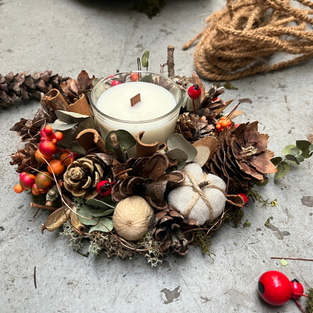 • JESENNÝ SVIETNIK plný prírodnín, tekvičiek, stabilizovaného machu a drevených detailov z našej dielne – vhodný na stôl, okno alebo ako milý darček.